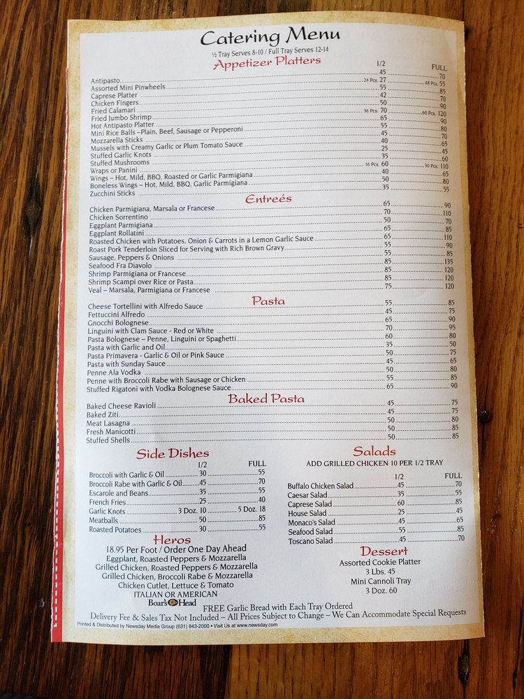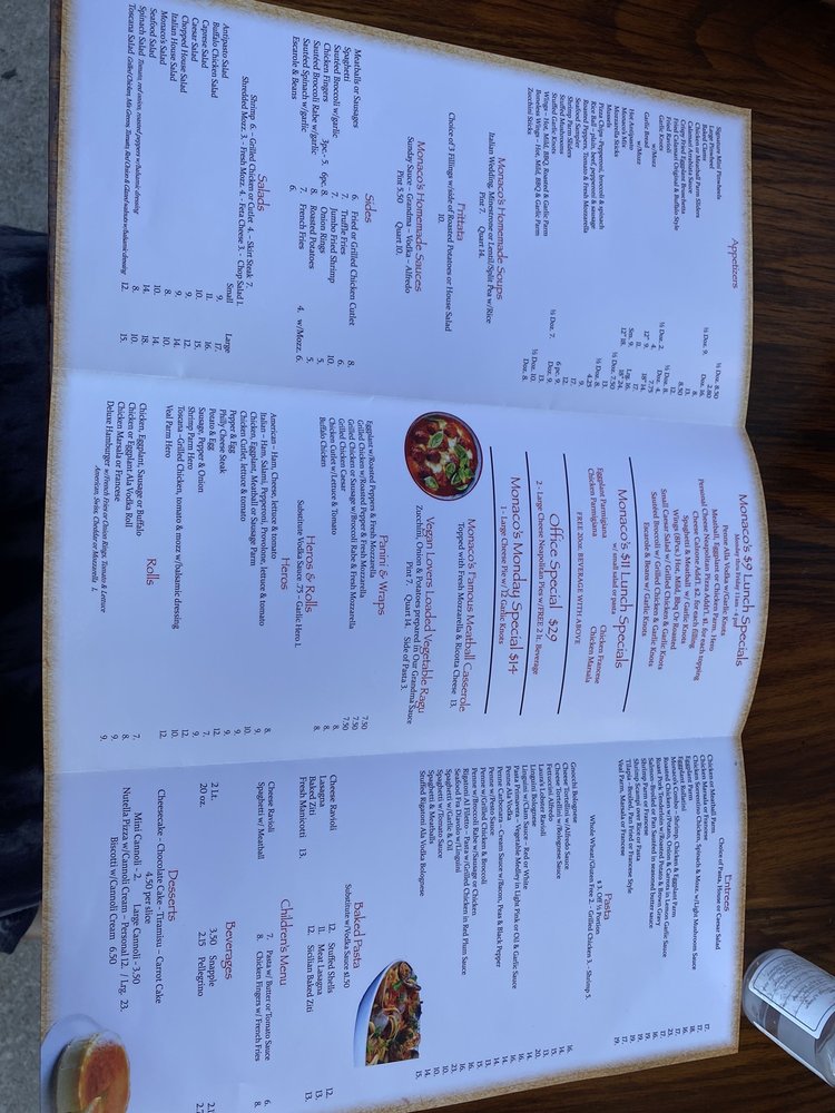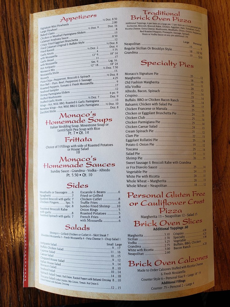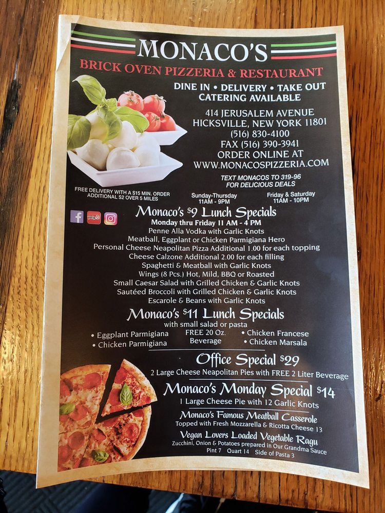 Monaco's Pizzeria & Restaurant in Hicksville, NY offers a variety of delicious pizzas and Italian dishes. The menu includes appetizers like Buffalo Wings, Baked Clams, and Fried Ravioli, as well as unique options such as Mike's Hot Honey Specials. Customers rave about the flavorful pizza, with one reviewer praising the owner's excellent service and another delighted by the distinct sauce used. The restaurant also caters to various dietary preferences with vegan options available. Whether you're dining in or ordering takeout, Monaco's provides a casual yet classy atmosphere perfect for families and groups. Don't miss out on the opportunity to try their signature dishes and experience the exceptional flavors that keep customers coming back for more.